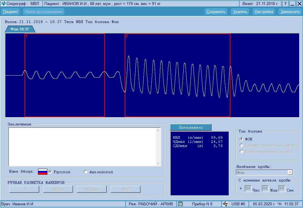 - отображение кривых дыхания в реальном времени, выбор лучших тестов